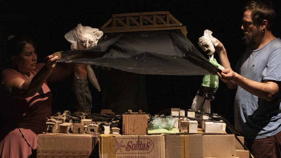 – Trabajamos con muletos o con bocetos para armar la obra, y después entraron los títeres, hechos de materiales originales de esos días de la inundación, propios de una ciudad que se estaba desarmando, como bolsas y cartón. Una vez que reorganizamos todo eso y construimos un par de mojones sobre los cuales montar, empezamos a probar esas hipótesis poéticas basándonos mucho en testimonios y en el tratamiento sobre esos testimonios. Jugamos con ellos, los pusimos, los dimos vuelta, y también intentamos dejarlos intactos. Esa era una intención de Javier. Así es que se mantienen casi textuales, aunque, al ser representados por títeres, se trabajan en toda su amplitud. Es decir, la forma y la actitud de esos los objetos y títeres y cómo se disponen los cuerpos hacen que los testimonios no queden como algo frío o muerto en el pasado, sino que se vuelvan activos y presentes.